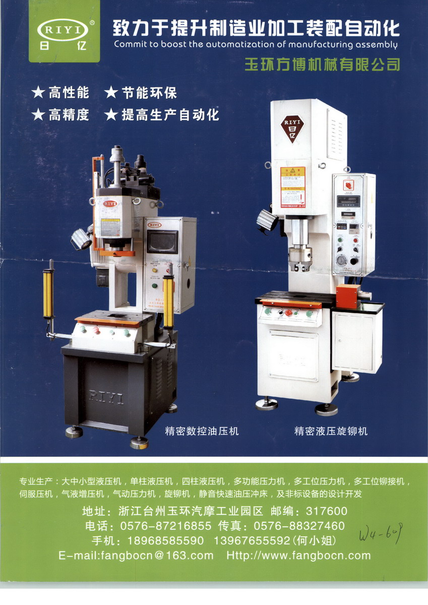 浙江玉環(huán)方博機(jī)械有限公司是一家專業(yè)致力于高速單柱液壓機(jī)、數(shù)控單柱液壓機(jī)、數(shù)控單臂液壓機(jī)、數(shù)控小型壓力機(jī)、中小型液壓機(jī)、單柱液壓機(jī)、單臂液壓機(jī)、四柱液壓機(jī)、數(shù)控液壓機(jī)、精密液壓機(jī)、全自動(dòng)液壓機(jī)、旋鉚機(jī),鉚接機(jī)、鉚釘機(jī)、小型壓力機(jī)、四柱油壓機(jī)、全自動(dòng)油壓機(jī)、弓形油壓機(jī)、多功能液壓機(jī)、通用液壓機(jī)、多工位壓力機(jī)、轉(zhuǎn)盤式壓力機(jī)、伺服壓力機(jī)、伺服壓裝機(jī)、伺服沖床,電子壓裝機(jī)、伺服液壓機(jī)、伺服油壓機(jī)、電液伺服壓力機(jī)、氣液增壓機(jī)、氣動(dòng)壓力機(jī)、氣動(dòng)沖床、全自動(dòng)旋鉚機(jī)、油壓沖床、數(shù)控油壓機(jī)、油壓拉伸機(jī)、及各種非標(biāo)壓力機(jī)的設(shè)計(jì)開發(fā)、制造與技術(shù)服務(wù)的高新技術(shù)企業(yè)。產(chǎn)品廣泛使用于汽車零部件,家電,五金,橡膠,粉末治金等行業(yè)的裝配-滾壓-拉伸成形-彎曲-鉚壓-熱壓-壓印等加工。本公司在引進(jìn)德國(guó)、日本等國(guó)家先進(jìn)的控制技術(shù)及機(jī)床設(shè)計(jì)理念的基礎(chǔ)上,結(jié)合國(guó)內(nèi)相關(guān)行業(yè)的實(shí)際需要,開發(fā)出各種臺(tái)式、落地式全系列機(jī)床。液壓密封件、氣動(dòng)密封件、電磁閥、液壓缸等都選用國(guó)外知名企業(yè)品牌產(chǎn)品、部分選用國(guó)內(nèi)品牌。控制系統(tǒng)選用德國(guó)西門子PLC、日本歐姆龍、法國(guó)斯耐德等知名品牌的電器元件,使設(shè)備性能更加穩(wěn)定,操作方便。本公司機(jī)身等鑄件采用精密鑄造,高溫處理、去應(yīng)力退火、正火、自然時(shí)效處理等消除內(nèi)應(yīng)力,保證鑄件性能,防止鑄件變形和破壞,氣動(dòng)床身采用QT450球墨鑄鐵并經(jīng)過各種必要的熱處理保證鑄件性能。本公司擁有一支專業(yè)從事專業(yè)機(jī)床設(shè)計(jì)、加工與維修服務(wù)的技術(shù)隊(duì)伍,能夠獨(dú)立完成機(jī)械結(jié)構(gòu)、電器與壓力控制系統(tǒng)的設(shè)計(jì);并應(yīng)用現(xiàn)代優(yōu)化設(shè)計(jì)理念與分析軟件,進(jìn)行受力分析和優(yōu)化設(shè)計(jì);能夠自主完成產(chǎn)品的全部機(jī)械加工與組裝調(diào)試,可以根據(jù)客戶需要進(jìn)行各種特殊的非標(biāo)準(zhǔn)機(jī)器與模具的設(shè)計(jì)和制作,產(chǎn)品生產(chǎn)周期短,并且提供運(yùn)輸、安裝、調(diào)試等一條龍服務(wù)。本公司的產(chǎn)品曾出口美國(guó),英國(guó),法國(guó),墨西哥,意大利,土耳其,日本,韓國(guó),西班牙,德國(guó),意大利,智利,埃及,泰國(guó)等等。玉環(huán)方博機(jī)械有限公司是壓力機(jī)、中小型液壓機(jī)、四柱液壓機(jī)、油壓機(jī)、氣壓機(jī)、增壓機(jī)、旋鉚機(jī)、多工位壓力機(jī)、全自動(dòng)壓鉚機(jī)等產(chǎn)品專業(yè)生產(chǎn)加工的有限責(zé)任公司(自然人投資或控股),公司總部設(shè)在浙江玉環(huán)汽摩配工業(yè)園,玉環(huán)方博機(jī)械有限公司擁有完整、科學(xué)的質(zhì)量管理體系。玉環(huán)方博機(jī)械有限公司的誠(chéng)信、實(shí)力和產(chǎn)品質(zhì)量獲得業(yè)界的認(rèn)可。歡迎各界朋友蒞臨玉環(huán)方博機(jī)械有限公司參觀、指導(dǎo)和業(yè)務(wù)洽談。