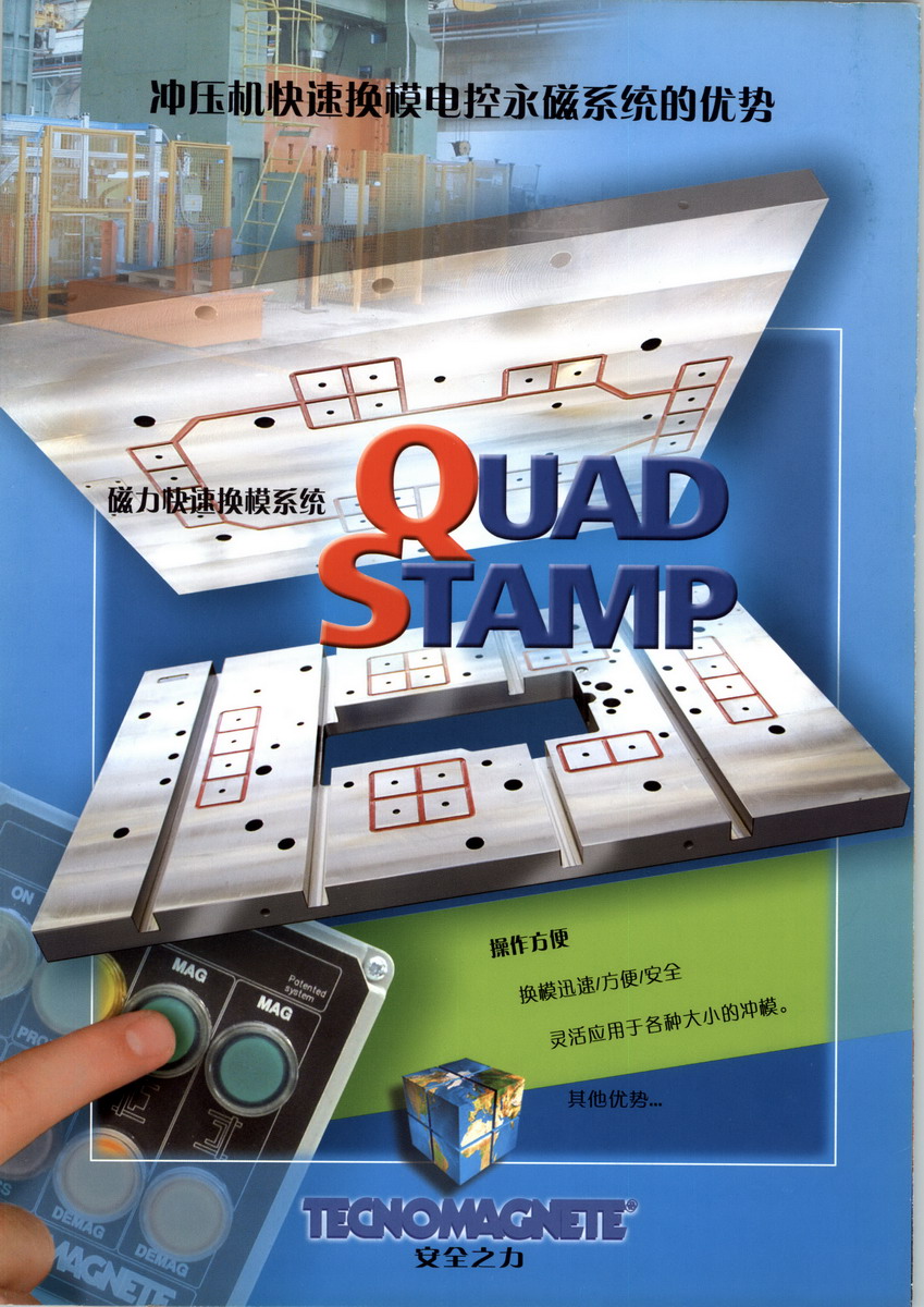 泰磁快速換模系統(tǒng)作為一個(gè)完整的解決方案用來滿足先進(jìn)的制造過程中小批量、多類別生產(chǎn)的JIT(實(shí)時(shí)生產(chǎn))和SMED(快速更換)的要求。 采用完美的“雙磁極對(duì)流”技術(shù),具有磁場(chǎng)集中,磁吸附力強(qiáng),不磁化設(shè)備,克服間隙能力強(qiáng),磁穿透高度可控等優(yōu)點(diǎn)。將電控永磁的磁力的應(yīng)用發(fā)回到極致。 意大利泰磁公司Tecnomagnete S.p.A.始建于1972年,是全球電控永磁產(chǎn)品領(lǐng)域中的領(lǐng)先公司,發(fā)明了一系列革命性創(chuàng)新產(chǎn)品,設(shè)計(jì)、制造全系列電控永磁夾持及吊重系統(tǒng)。產(chǎn)品包括:注塑機(jī)快速換模系統(tǒng)、銑削、磨削、立車、鐵軌加工用電控永磁夾盤、手動(dòng)永磁吊重器及重型電控永磁吊重設(shè)備(用于成卷鋼帶、大型鋼板等的吊運(yùn))等。