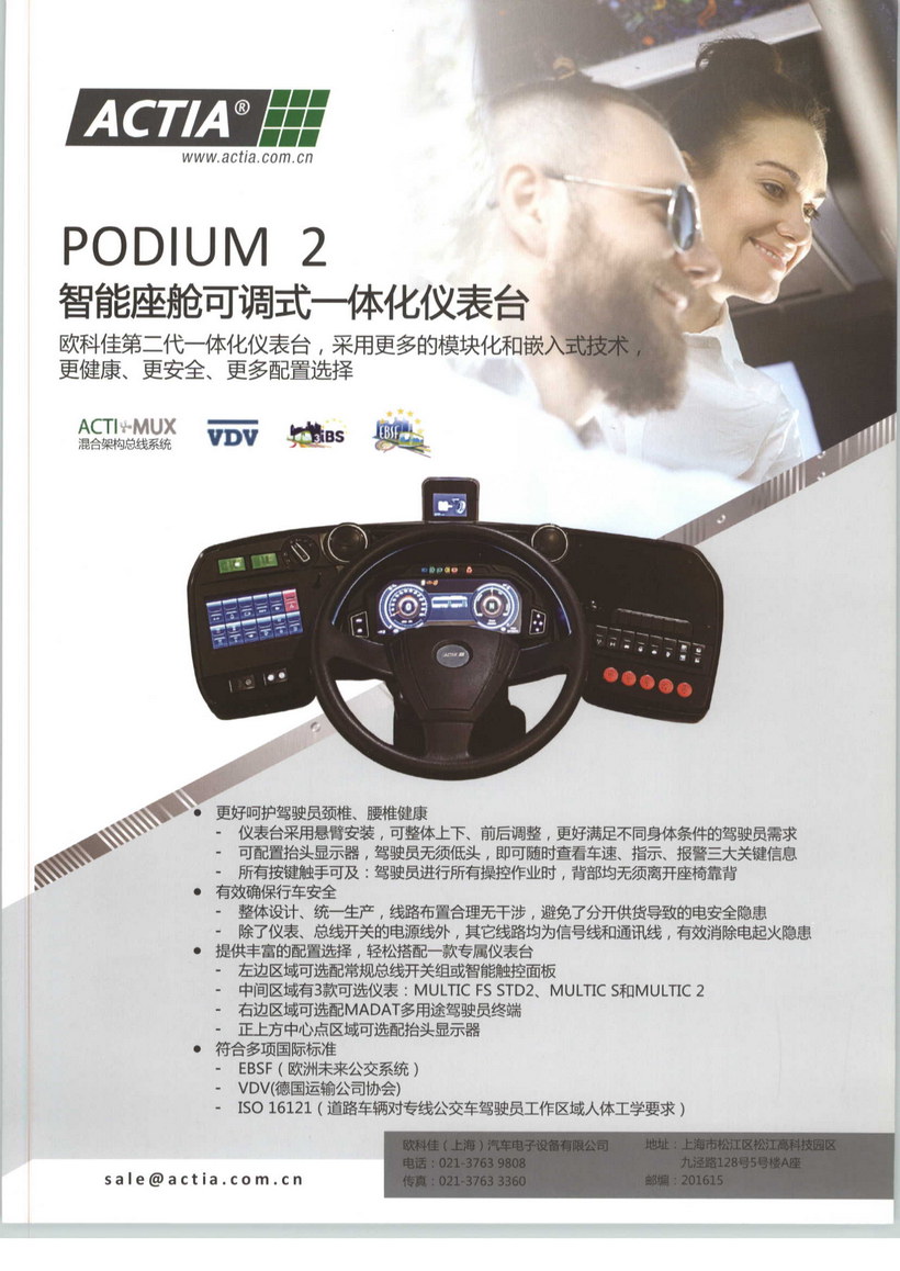 歐科佳(上海)汽車電子設備有限公司成立于2003年,是法國歐科佳集團(ACTIA Automotive)在中國的獨資子公司,為商用車、乘用車、非道路機械提供車載電子設備與架構系統,以及汽車電子檢測與診斷設備及軟件系統,是宇通、廈門金旅、廈門金龍、蘇州金龍、中通、安凱、亞星、申沃、寶馬、奔馳、大眾、沃爾沃、PSA、東風、長安、廣汽、華晨、三一重工、徐工、博雷頓、星光農機等國內外眾多主機廠的首選或標配供應商。歐科佳的產品與方案采用國內、國際領先的技術,質量可靠穩定,具有良好的兼容性、擴展性,滿足國內、國際相關標準,海外高端市場占有率高。自成立以來,歐科佳中國一直致力于引介全球前沿技術,推動行業新發展。2004年,率先將CAN總線技術引入中國客車市場并推廣。2009年、2012年,舉辦第一屆和第二屆汽車故障診斷技術及發展國際研討會。2013年,在國內推廣應用DMT車載智能信息系統解決方案并率先開始在行業介紹EBSF Project歐洲未來公交系統。DMT車載智能信息系統解決方案全面整合了CAN總線、故障診斷、維保專家系統、車聯網技術、車隊管理系統。2017年,開始在客車行業介紹歐洲ITxPT標準。2019年,發布歐科佳新一代智能網聯架構ITxPT,舉辦第三屆汽車故障診斷技術及發展國際研討會。2021年,發布歐科佳客車電子信息及控制系統集成方案。2023年,發布歐科佳車輛網絡安全解決方案。