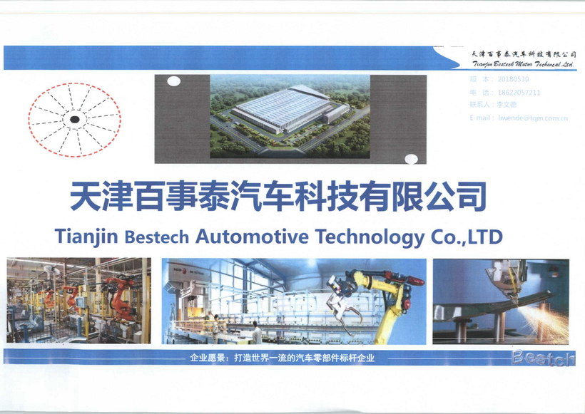 天津百事泰汽車科技有限公司,交通便利,位于天津空港經濟區,距離天津機場3公里,緊鄰京津塘高速,注冊資金5000萬元;占地面積5800平方米,一期總設備投資3500萬元,主營業務為熱沖壓零件生產、產品研發。