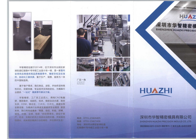 華智精密創建于2014年,位于深圳市光明區新湖街道紅銀路41號華順工業園6棟一樓,是一家面向全球供應商提供高品質模具零件、精密非標及標準件、自動化工裝夾具,集于生產、銷售、服務為一體的中國制造商。基于客戶需求,我們務實、進取、并始終堅持高性價比、貨期快捷、專業技術支持的定位,為模具行業提供“一站式”模具零件解決方案。華智精密,工廠員工近百人,擁有CNC電腦鑼、精密磨床、線割機、銑床、精密自動水磨、數控車床,EDM,慢走絲,二次元、三次元、高度儀等全套設備,為模具行業高速發展提供專業服務 展望未來,我們將持續秉承“尊重、信任、積極、拼搏、誠信,價值、業績、創新“的經營理念,定位于客戶,社會,及我們的員工創造長遠的價值,并實現持續增長,成就塑膠模具行業的精彩,共創美好生活!