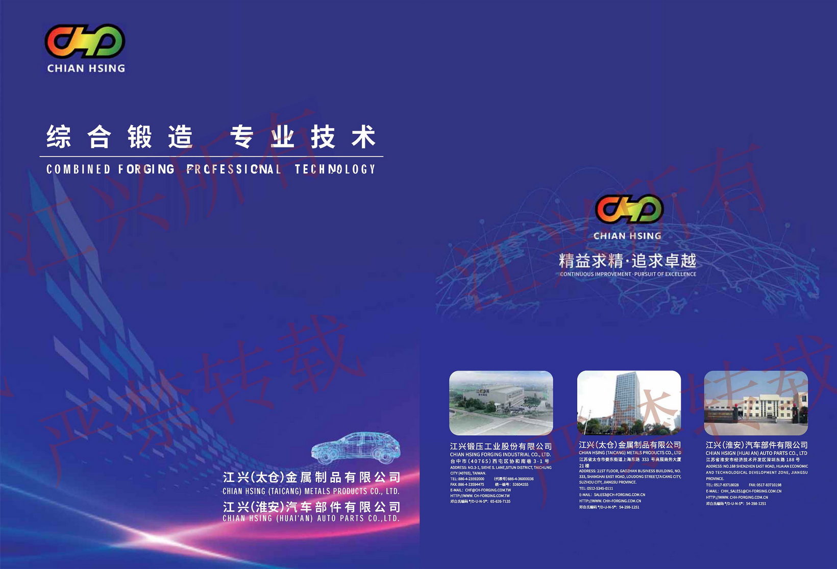 江興鍛壓工業(yè)股份有限公司自西元1971年創(chuàng)立以來,秉持著「顧客滿意、同仁樂意、經(jīng)營得意、永續(xù)經(jīng)營」之經(jīng)營理念,不斷開發(fā)綜合鍛造之技術(shù),使本公司所生產(chǎn)的鍛品更優(yōu)良、更精密、更能減少切削加工,使鍛品更臻于理想。于1997年在江蘇省太倉市設(shè)立江興(太倉)金屬制品有限公司,以及2012年設(shè)立江興(淮安)汽車部件有限公司,延續(xù)臺灣總部的經(jīng)營理念和專業(yè)技能,持續(xù)在國內(nèi)發(fā)展并精進冷溫熱綜合鍛造技術(shù)。