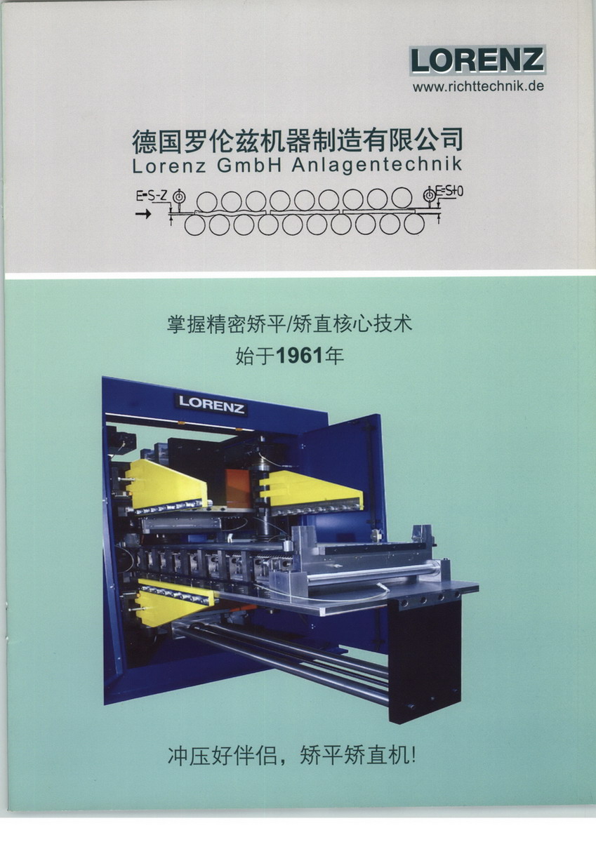 德國羅倫茲機器制造有限公司由H. Lorenz先生于1988年1月1日創立,專業生產19/21輥精密矯平設備, 9輥矯直裝置, 開卷機和收卷機, 電動輥喂料器和橫向零件進給裝置. 所有設備所需電氣,氣動和液壓控制裝置也有我們自己的特點. 我司是矯平矯直技術的創始人.